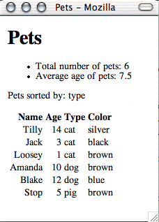 <pets> <pet> <name>Tilly</name> <age>14</age> <type>cat</type> <color>silver</color> </pet> <pet> <name>Amanda</name> <age>10</age> <type>dog</type> <color>brown</color> </pet> <pet> <name>Jack</name> <age>3</age> <type>cat</type> <color>black</color> </pet> <pet> <name>Blake</name> <age>12</age> <type>dog</type> <color>blue</color> </pet> <pet> <name>Loosey</name> <age>1</age> <type>cat</type> <color>brown</color> </pet> <pet> <name>Stop</name> <age>5</age> <type>pig</type> <color>brown</color> </pet> </pets>
