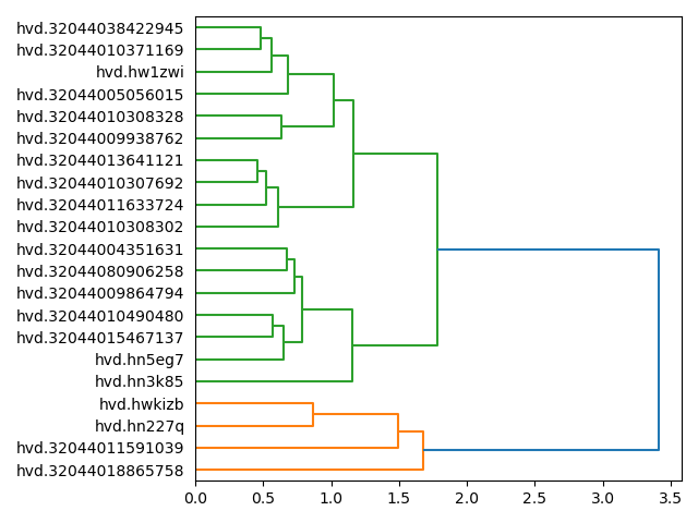rdr cluster emerson-worksrdr tm emerson-works -t 2 -w 12rdr tm emerson-works -p read -o chartrdr tm emerson-works -p read -o chart -y bar -f titlePossibly, there are two dominant themes on the corpus, and the corpus is grossly divided between the two, as illustrated with following dendrogram: